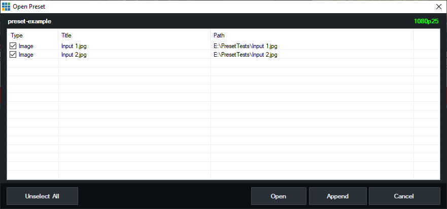 Once a Preset has been selected the Open Preset window will appear.