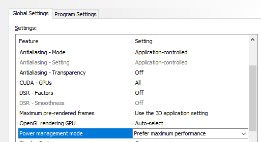 3. From the NVIDIA Control Panel, go to the Manage 3D settings and set Power Management Mode to 'Prefer Maximum Performance'